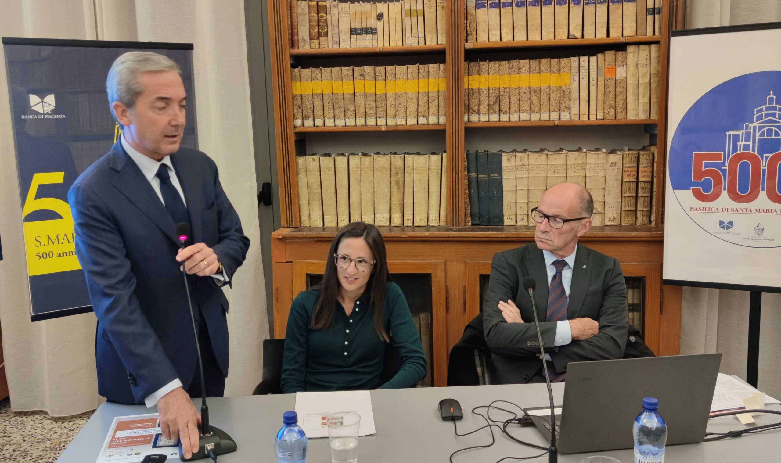 Com’è cambiata, nel tempo, Santa Maria di Campagna. Lo hanno spiegato Elena Montanari e Roberto Tagliaferri – presentati dal condirettore della Banca di Piacenza Pietro Coppelli – nel corso dell’incontro per “I Giovedì della Basilica” che si è tenuto questa sera nella Biblioteca del Convento, nell’ambito delle Celebrazioni dei 500 anni della chiesa di piazzale delle Crociate dove, nel marzo del 1095 – ha ricordato l’arch Montanari -, Papa Urbano II convocò il Concilio nel quale venne decisa la Prima Crociata. Le indulgenze concesse dal Pontefice diedero maggior impulso alla venerazione della Madonna di Campagna – statua risalente al secolo XIV che ancora oggi vediamo – custodita nella chiesuola di Santa Maria in Campagnola, costruita dopo l’anno Mille nel luogo di sepoltura dei primi martiri cristiani. «A un certo punto la piccola chiesa – ha continuato la relatrice – non era più in grado di contenere i fedeli della città e i pellegrini della Francigena. Fu così che il 27 dicembre del 1521 nacque la Fabbriceria per la costruzione di un tempio più grande che, come recita il rogito notarile stilato da Giovanni Francesco da Parma, doveva inglobare la prima Cappella». Il 3 aprile del 1522 venne stipulata la convenzione con l’architetto piacentino Alessio Tramello e il 13 dello stesso mese ci fu la posa della prima pietra (di cui quest’anno si celebra appunto il cinquecentenario) alla presenza del vescovo Scaramuccia Trivulzio. Nel 1528 la fabbrica venne ultimata. L’arch. Montanari ha quindi citato la cronaca di Antonio Francesco da Villa che il 24 ottobre 1531 riferì del trasporto della statua della Madonna dalla chiesa vecchia a quella nuova: “Con gran solennità venne collocata nella nuova Cappella e il Papa Clemente VII concesse l’indulgenza plenaria”. Detta Cappella (che terminava dove è collocato l’altare consacrato nel 1794), affrescata dai fratelli Campi, andò distrutta nel 1791 con l’intervento di Lotario Tomba che sistemò il Coro e il Presbiterio allungando la planimetria della chiesa. Prima dell’intervento del Tomba l’antica chiesuola veniva utilizzata dai frati come coro ed era collegata alla Basilica da un andito (corridoio). «Secondo le testimonianze di metà ‘500 – ha sottolineato l’arch. Montanari – il Pozzo dei martiri era “situato al centro della nuova chiesa”. Da ciò si desume che il Tramello abbia demolito la zona absidale della vecchia chiesuola, andando così ad inglobare il pozzo e mantenendo il resto della primitiva struttura».