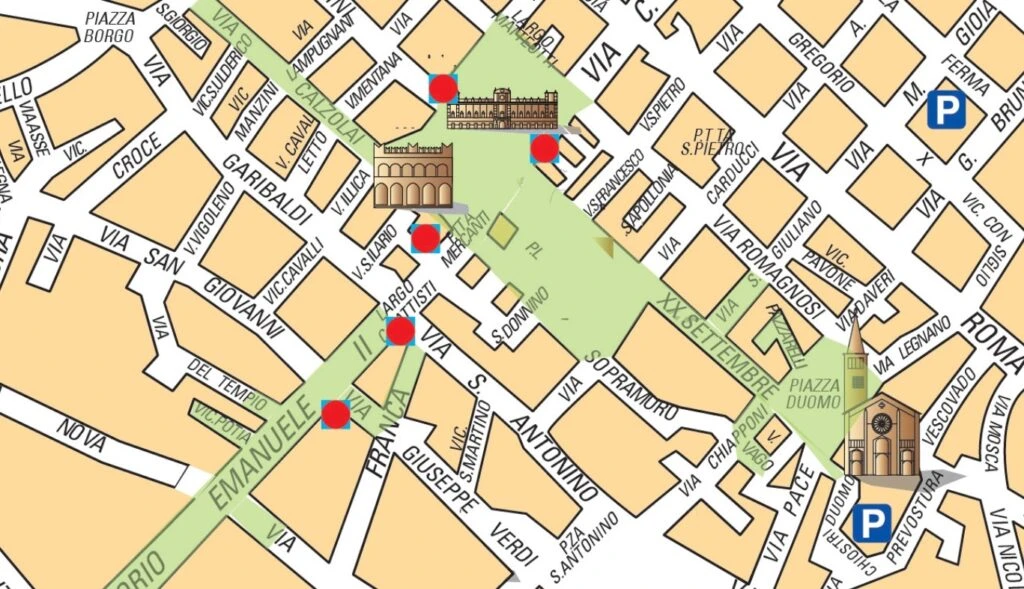 Le vie e piazze individuate come pedonali, in cui – fatta eccezione per le deroghe elencate – è vietata la circolazione 7 giorni su 7, 24 ore su 24, sono le seguenti:
