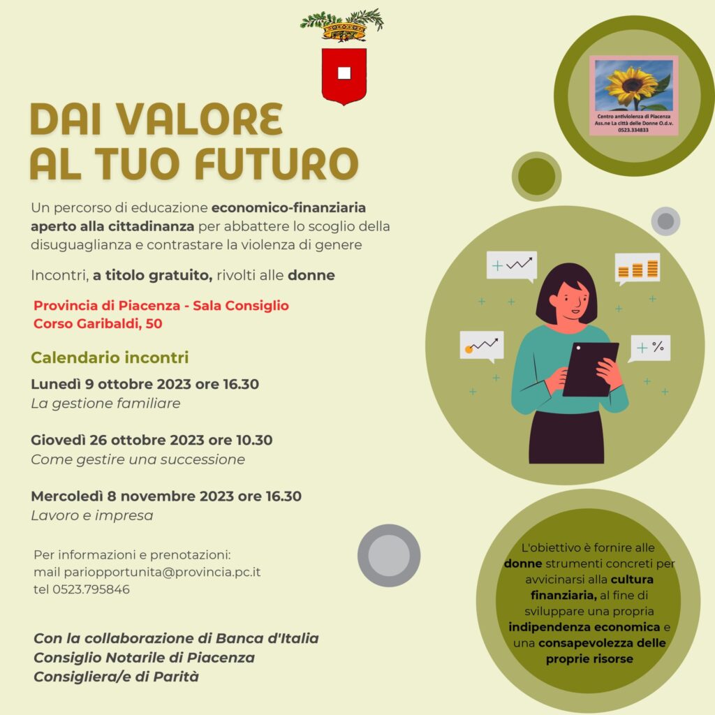 L’iniziativa, presentata ufficialmente lo scorso 13 settembre, è frutto della collaborazione tra la Provincia di Piacenza, il Centro Antiviolenza di Piacenza Associazione La Città delle Donne O.d.v., la Banca d’Italia, il Consiglio Notarile di Piacenza e le Consigliere di Parità. Saranno organizzati tre incontri, della durata di un’ora e mezza ciascuno, che si terranno nella Sala Consiglio del Palazzo della Provincia in Corso Garibaldi, 50 a Piacenza.