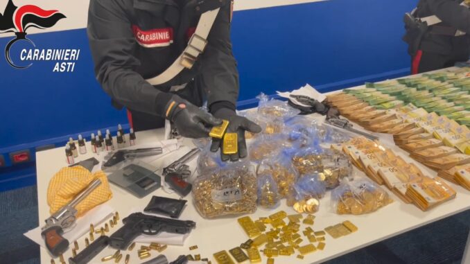 Decine di chili di oro proveniente da furti in abitazioni del Nord Italia e diretto in Svizzera, operazione dei Carabinieri del Comando Provinciale di Asti che scoprono un’associazione per delinquere dedita al riciclaggio del metallo prezioso, 6 arresti in Italia e altri provvedimenti in Svizzera. 15 pistole, decine di chili d’oro e 1 milione di euro in contanti sequestrati.