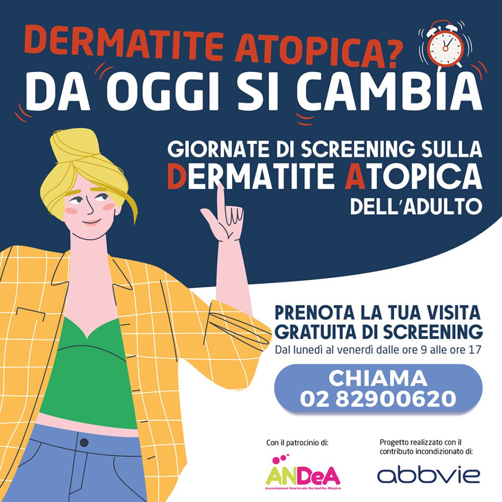 “Dermatite Atopica? Da oggi si cambia” è realizzata in collaborazione con ANDeA (Associazione Nazionale Dermatite Atopica) e grazie al contributo incondizionato di AbbVie. Per prenotare la visita è a disposizione il contact center dedicato dalle 9 alle 17 al numero 02 8290 0620, ulteriori informazioni sul sito dell’iniziativa.