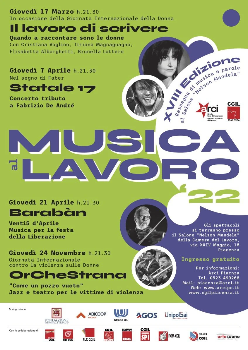 La diciottesima edizione di Musica al Lavoro, rassegna di musica e parole organizzata da Arci e Cgil di Piacenza, arriva in questo 2022 alla 18esima edizione. La rassegna ha subito le conseguenze della pandemia che ci ha colpito così duramente in modo imprevisto e brusco.