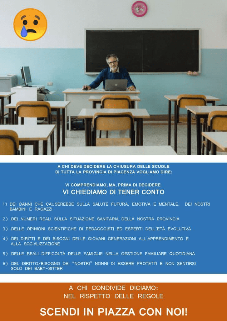 Un sit-in per denunciare i danni della didattica a distanza. Una mobilitazione nazionale che a Piacenza ha condotto il pedagogista Daniele Novara, direttore del centro psicopedagogico per la pace e la gestione dei conflitti.