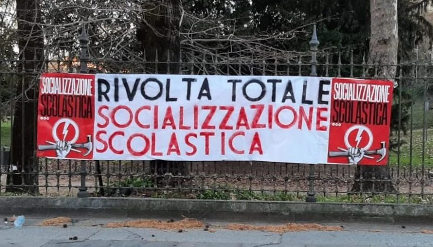 Striscioni contro la didattica a distanza: “Rivolta Totale. Socializzazione scolastica!”.