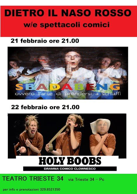 “Dietro al naso rosso” spettacoli il 21 e 22 febbraio al Trieste 34. La sesta edizione della rassegna di spettacoli comici, clown e visual parte venerdì alle ore 21 con Anselmo Luisi in “Sbadabeng”. Un evento in collaborazione con Patatrak Teatro.