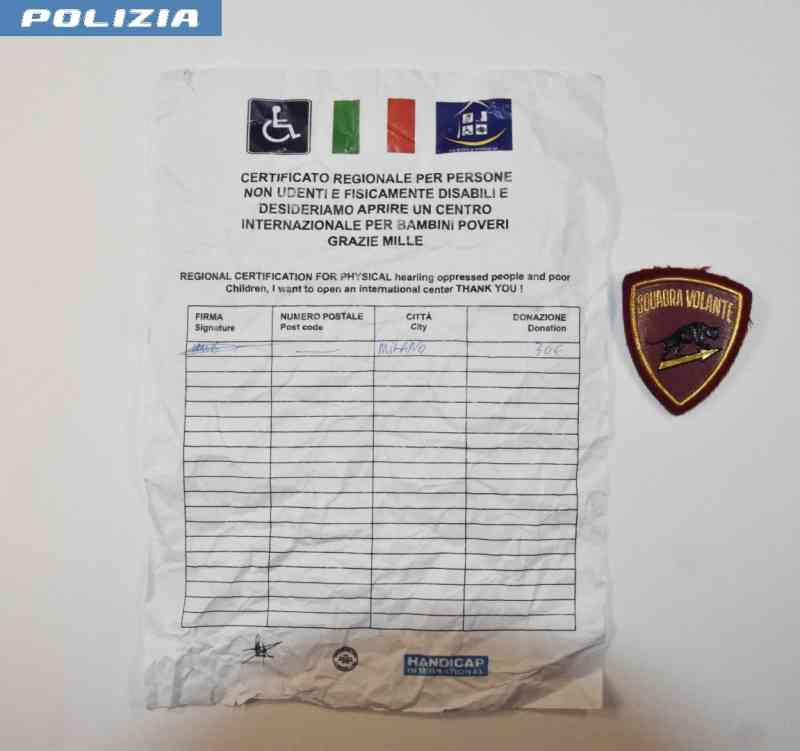 Fermata e controllata, gli agenti l’hanno trovata in possesso di un volantino riportante la sigla di una finta associazione a sostegno dei disabili e con un modulo per la donazione, sul quale erano presenti firme ed importi di presunte donazioni già effettuate.