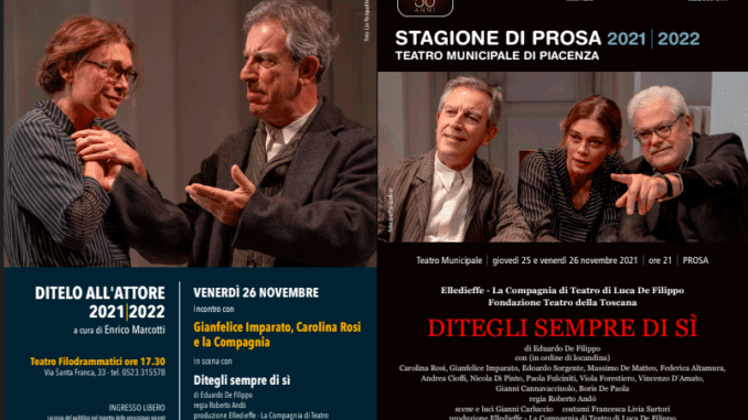Venerdì 26 novembre alle ore 17.30 al Teatro Filodrammatici Gianfelice Imparato, Carolina Rosi e la Compagnia in scena con “Ditegli sempre di sì” incontrano il pubblico. L’appuntamento è inserito nel programma di “Ditelo all’attore” curato dal critico teatrale Enrico Marcotti. Sono infatti ripresi gli incontri con i protagonisti della Stagione di Prosa del Teatro Municipale di Piacenza, proposti da Teatro Gioco Vita con l’Associazione Amici del Teatro Gioco Vita e il sostegno della Fondazione di Piacenza e Vigevano nell’ambito dei progetti di InFormazione Teatrale.