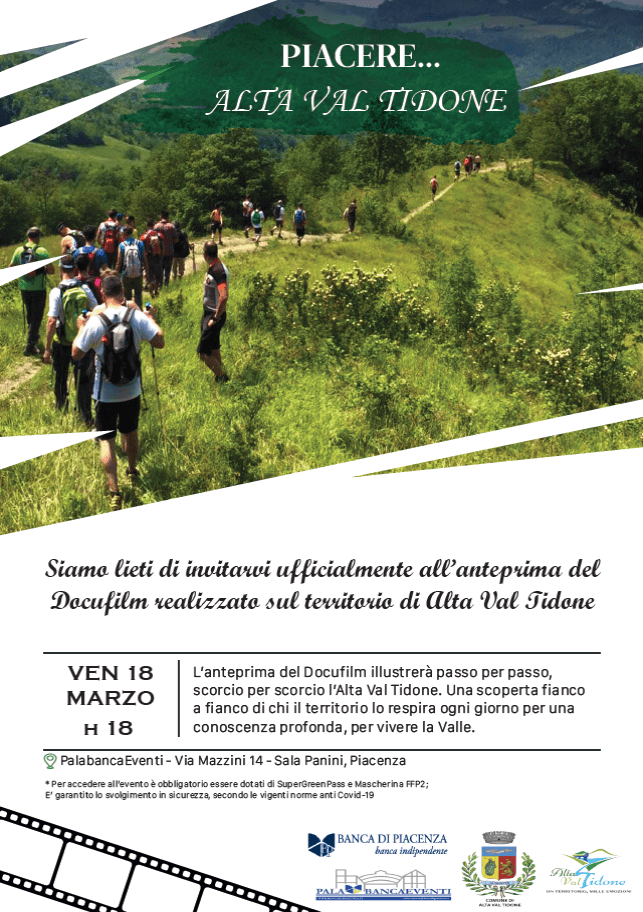 Venerdì 18 Marzo alle ore ore 18 a Piacenza alla Sala Panini del PalabancaEventi (via Mazzini 14) il Comune di Alta Val Tidone presenta l’anteprima, e il dietro le quinte, del docu-film “Piacere… Alta Val Tidone”.