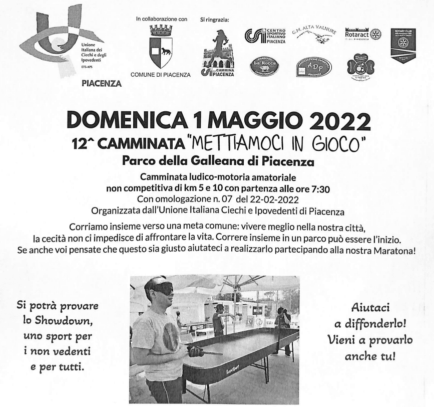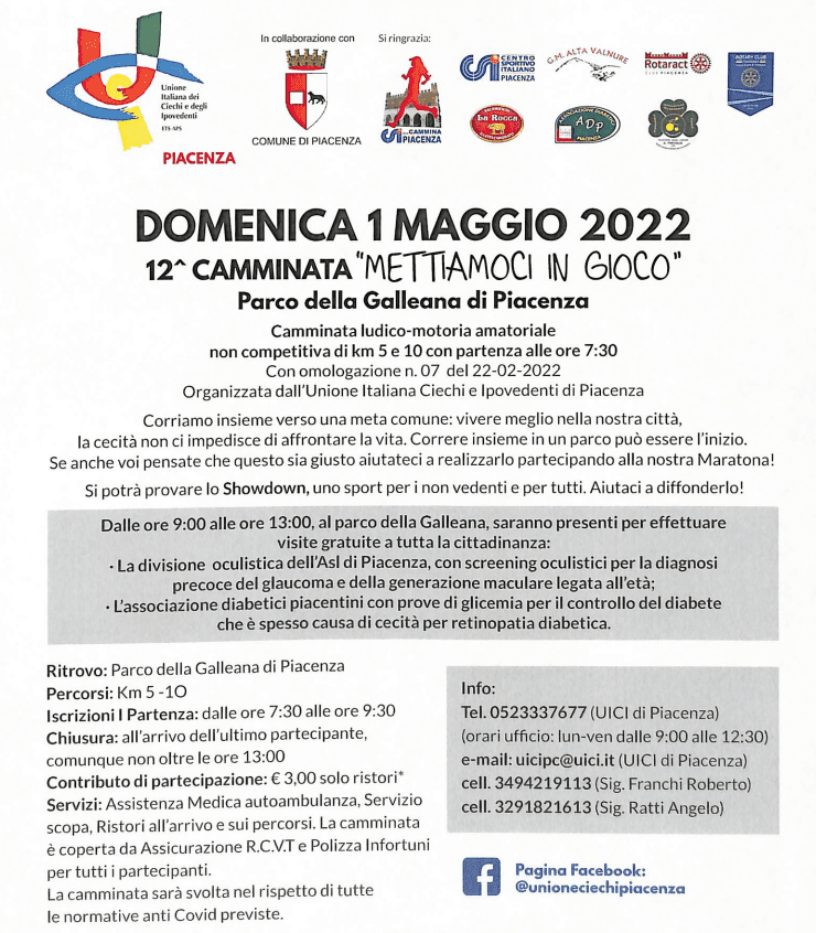 Camminata ludico-motoria amatoriale non competitiva di km5 e 10 con partenza alle ore 7.30. Corriamo insieme verso una meta comune: vivere meglio nella nostra città. La cecità non ci impedisce di affrontare la vita. Correre insieme in un parco può essere l’inizio. Se anche voi pensate che questo sia giusto aiutateci a realizzarlo partecipando alla nostra maratona!