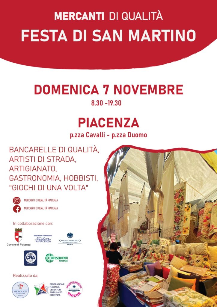 Domenica 7 novembre a Piacenza, in centro storico, torna il tradizionale appuntamento con la Festa di San Martino. Le performance degli artisti di strada, i giochi di una volta e tanti spettacoli on the road renderanno il centro storico un palcoscenico a cielo aperto e faranno da corollario ad un mercato straordinario ricco di proposte. Ben 35 gli operatori commerciali che saranno presenti. La manifestazione inizierà alle 8,30 e proseguirà fino alle 19,30. Una manifestazione che vede la collaborazione di tante anime del territorio, decisi a fare rete per assecondare il rilancio della nostra provincia: Mercanti di Qualità, Federazione Italiana Venditori Ambulanti in collaborazione con il Comune di Piacenza, Associazione Commercianti Vita in Centro a Piacenza, Confcommercio, Confesercenti e Cna.