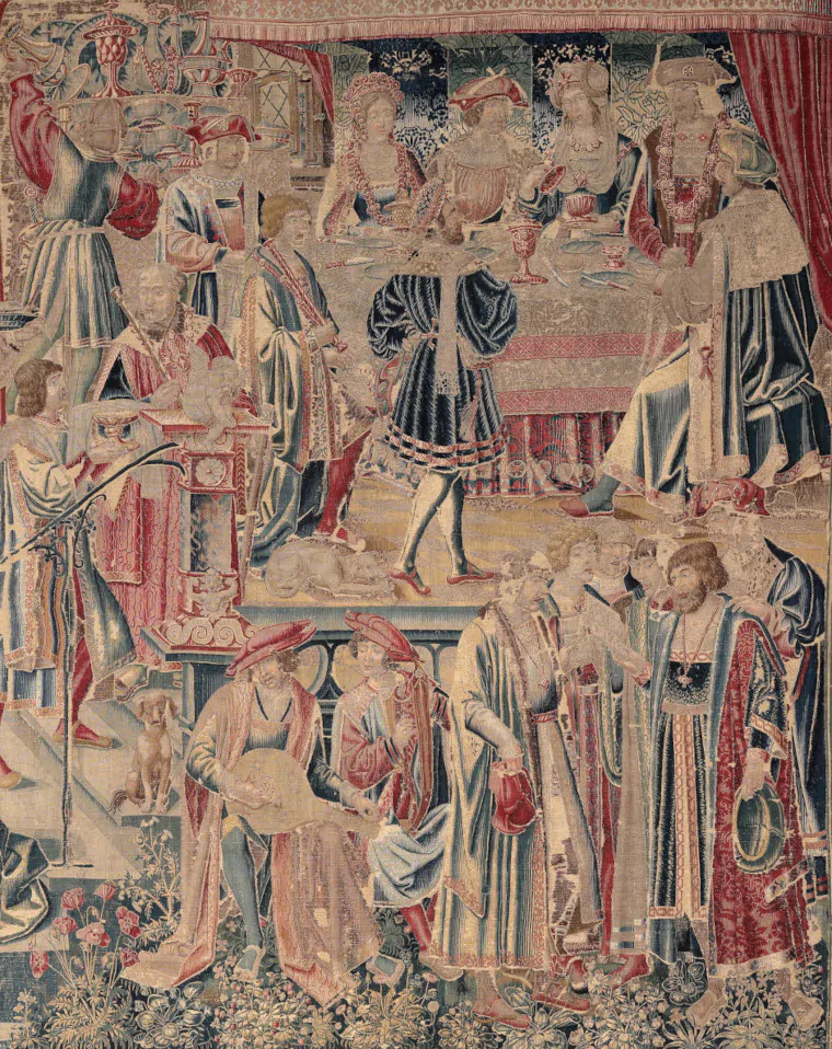 Questi ultimi sono due pezzi in lana e seta dalle dimensioni eccezionali, quasi quattro metri d’altezza e cinque e mezzo di lunghezza, con due sontuose raffigurazioni: un Corteo regale sul primo e un Ricevimento con banchetto di nozze sul secondo. La narrazione procede da sinistra a destra e tutti i personaggi sono abbigliati con eleganti e fastosi costumi alla moda borgognona, quella ancora in uso nei Paesi Bassi al principio del Cinquecento. Nel primo arazzo sopra un alabarda portata da un vecchio con turbante vi è la scritta Preamvs, fatto che ha condotto al riconoscimento della vicenda narrata nei due manufatti: si tratta di un episodo tratto dal Romanzo di Troia, una narrazione tardo-medievale ispirata alle vicende della Guerra di Troia, molto in voga nelle corti nord-europee a partire dalla fine del Trecento. L’interpretazione corrente vuole che ci troviamo di fronte al racconto del matrimonio tra Priamo ed Ecuba, ma forse è più corretto riconoscervi – secondo una recente proposta di Nello Forti Grazzini – l’arrivo in nave di Paride ed Elena a Troia, dove essi sono accolti dai genitori dell’eroe Priamo ed Ecuba (primo arazzo), e il banchetto organizzato per festeggiali, come induce a pensare la presenza di quattro personaggi di rango regale – due più vecchi e due più giovani – alla tavola raffigurata in alto a destra sul secondo arazzo. Nulla sappiamo circa la committenza di questi due prestigiosi pezzi, che deve essere comunque stata di alto livello: sono stati sicuramente tessuti a Bruxelles, intorno al 1520, da un arazziere che è stato variamente identificato dagli specialisti, ora in Pieter de Pannemaker ora in Pieter Van Aelst (documentato dal 1509 al 1555), più noto per aver tradotto i celebri cartoni di Raffaello per gli arazzi destinati alla Cappella Sistina. Anche il nome del “cartonista”, cioè di colui che ha fornito i disegni, rimane di problematica individuazione, anche se il nome speso più di frequente dagli studiosi è stato quello di Jan van Roome (doc. dal 1498 al 1521), attivissimo pittore e disegnatore per arazzi, vetrate e sculture presso la corte di Margherita d’Austria, reggente dei Paesi Bassi, a Mechelen e a Bruxelles nei primi anni del Cinquecento.