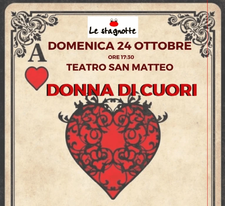 Domenica 24 ottobre alle ore 17.30 al Teatro San Matteo (vicolo San Matteo 8) va in scena “Donna di Cuori”. Lo spettacolo fa parte della rassegna TEATRO E OLTRE, organizzato dalle compagnie amatoriali di Piacenza.