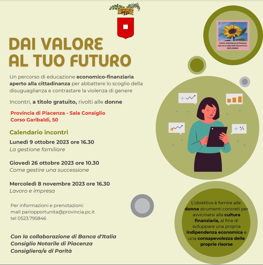 In calendario tre appuntamenti, che si terranno nella Sala Consiglio del Palazzo della Provincia (Corso Garibaldi, 50 – Piacenza. Per informazioni e prenotazioni: mail pariopportunita@provincia.pc.it tel. 0523.795846) e hanno l’obiettivo di contribuire ad abbattere lo scoglio della disuguaglianza e contrastare la violenza di genere: “La gestione familiare”lunedì 9 ottobre 2023 alle ore 16.30, “Come gestire una successione” giovedì 26 ottobre 2023 alle ore 10.30 e “Lavoro e impresa” mercoledì 8 novembre 2023 alle ore 16.30.