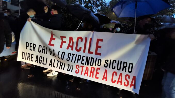 “Oltre ai mancati guadagni a cui andremo incontro fino al 24 novembre, vengono vanificati i fondi spesi per adattarci ai parametri di sicurezza”. Questo il concetto espresso nel corso della manifestazione di questa sera. Operatori sportivi, titolari di palestre, ristoranti e bar, dipendenti di questi settori si sono ritrovati in piazzale Genova. Centinaia di persone hanno protestato contro l’ultimo dpcm voluto dal governo Conte che prevede la chiusura totale delle palestre e la chiusura alle 18 per ristoranti e bar.