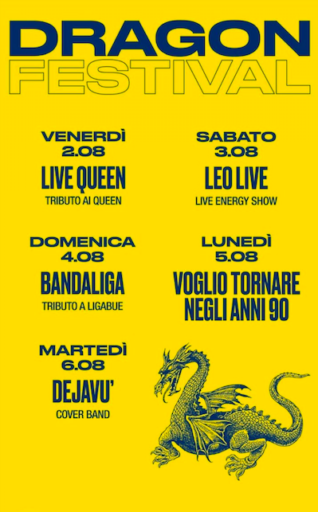 Si parte venerdì con il Live Queen Tribute, poi sabato Leo Live Energy Show e domenica i Bandaliga. La settimana dopo si apre il 5 agosto con “Voglio tornare negli anni 90” e martedì gran finale con iDejavù.