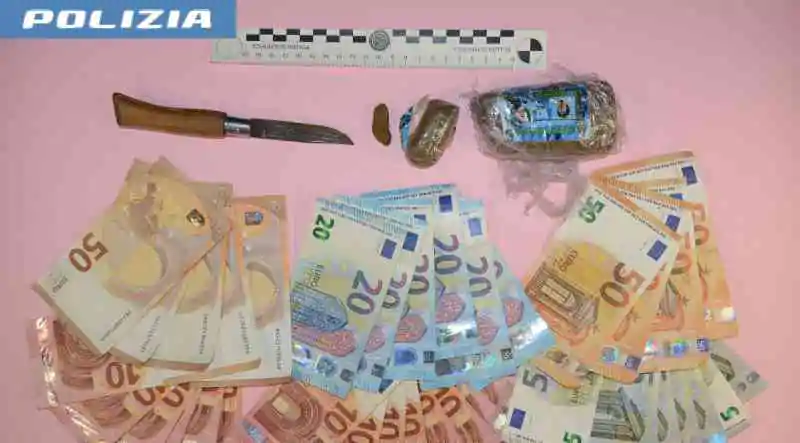 Dalla perquisizione effettuata sul fermato, veniva rinvenuto 1 hg e 15 gr. di hashish, un coltello a serramanico e diverse banconote, tutto materiale sottoposto a sequestro in quanto pertinente ai reati di detenzione ai fini di spaccio di sostanza stupefacente e porto illegale di arma.