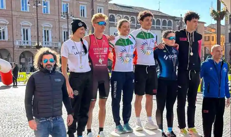 Il gruppetto entra in zona cambio compatto. La più veloce ad in filarsi le scarpe da running è Tania Molinari, ma le altre rientrano dopo poco. L’unica attardata in zona cambio è Frigerio, la più accreditata nella corsa, atleta élite di duathlon, già nazionale nel 2024 con diverse convocazioni a mondiali e europei, che infatti rientra dopo poco e inizia subito a far selezione con ripetuti cambi di ritmo.