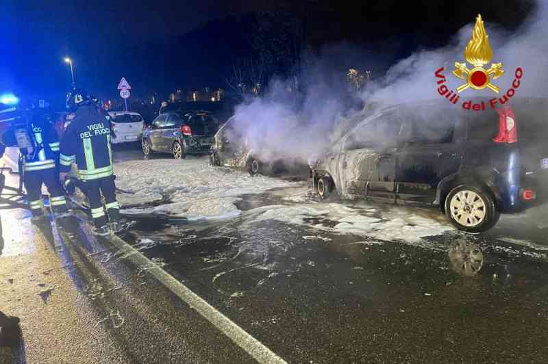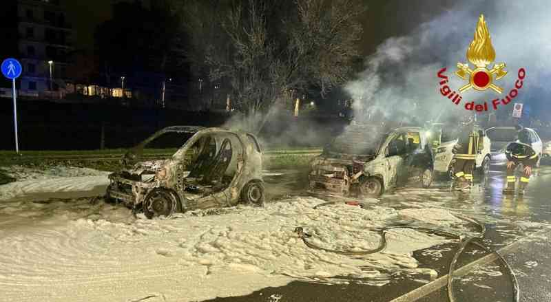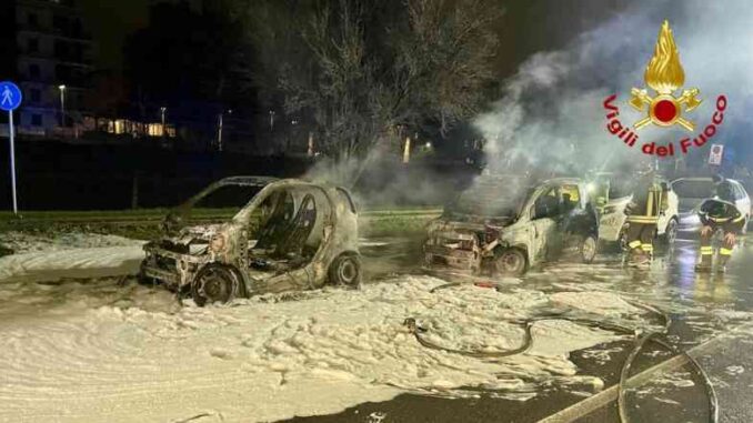 Due auto in fiamme nella notte. I fatti sono accaduti in via IV Novembre. Alcuni passanti hanno allertato i vigili del fuoco segnalando due vetture, parcheggiate lungo la carreggiata, avvolte dalle fiamme. I pompieri sono giunti sul posto e hanno estinto il rogo.