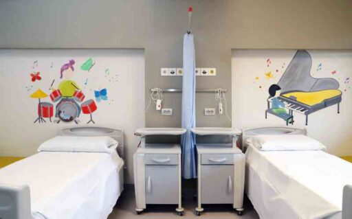 Ogni camera ospita due letti, decorazioni tematiche alle pareti e arredi in armonia cromatica. Le attrezzature sanitarie sono state integrate in modo discreto, per ridurre l’impatto visivo e l’ansia dei piccoli pazienti. Accanto al letto, è sempre presente un divano letto per i familiari.