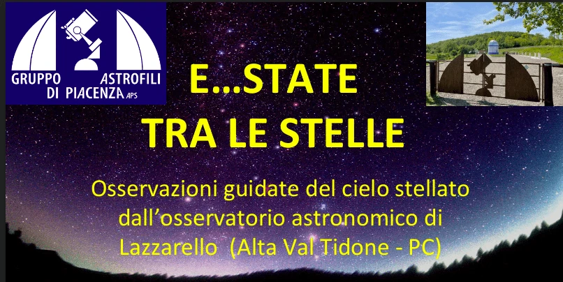 E..state tra le Stelle, osservazioni guidate del cielo stellato a cura del Gruppo Astrofili di Piacenza, dall’Osservatorio Astronomico a Lazzarello di Alta Val Tidone. Tutti i venerdì fino al 25 agosto dalle ore 21 prenderà il via uno spettacolo stellare gratuito per ammirare al telescopio: la Luna, Saturno, le Perseidi, gli ammassi stellari, le nebulose e le galassie. Dopo l’apertura del 4 agosto, si prosegue per tutto il mese con il seguente programma: