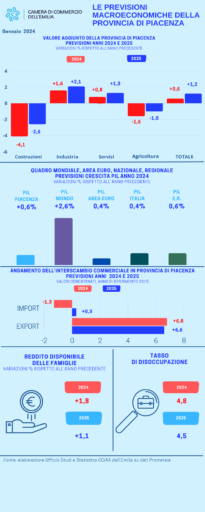 Per la provincia di Piacenza l’aumento del valore aggiunto per il 2024 dovrebbe attestarsi al +0,6%, con previsione di +1,2% per il 2025. Un dato, dunque, più alto rispetto alla media dell’area dell’Emilia occidentale.Lo sviluppo più significativo per il 2024 è previsto per l’industria, cui è attribuita una crescita dell’1,6% (+2,1% per il 2025) e per i servizi, a +0,8% (+1,3% per il 2025), mentre risultano in flessione l’agricoltura a -1,6% (-1,0% per il 2025) e le costruzioni a -4,1%, con previsioni di -2,6% per il 2025.