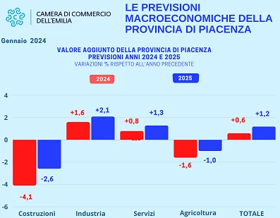 Per la provincia di Piacenza l’aumento del valore aggiunto per il 2024 dovrebbe attestarsi al +0,6%, con previsione di +1,2% per il 2025. Un dato, dunque, più alto rispetto alla media dell’area dell’Emilia occidentale.Lo sviluppo più significativo per il 2024 è previsto per l’industria, cui è attribuita una crescita dell’1,6% (+2,1% per il 2025) e per i servizi, a +0,8% (+1,3% per il 2025), mentre risultano in flessione l’agricoltura a -1,6% (-1,0% per il 2025) e le costruzioni a -4,1%, con previsioni di -2,6% per il 2025.