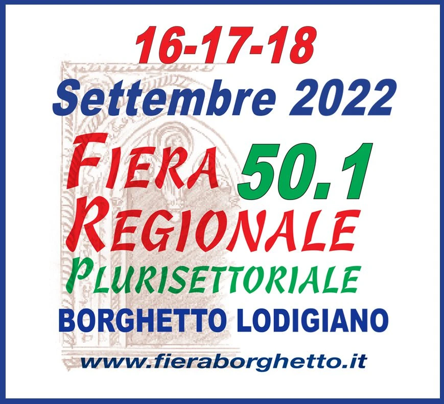 Edizione 50.1 della Fiera regionale Plurisettoriale di Borghetto Lodigiano dal 16 al 18 settembre. L’evento è organizzato da: Comune, Proloco di Borghetto Lodigiano con il contributo della BCC Centro Padana, e Regione Lombardia, in collaborazione con Confartigianato Imprese della provincia di Lodi, il Cittadino e Unione Artigiani.