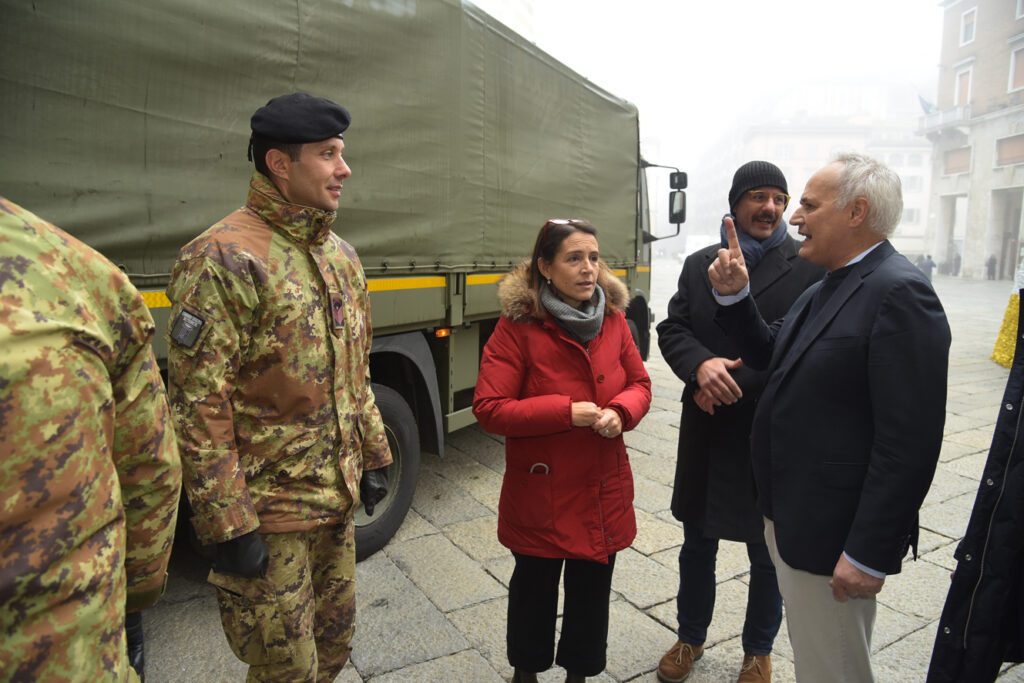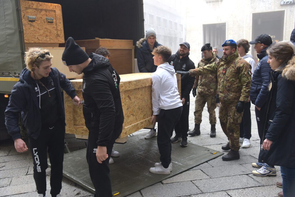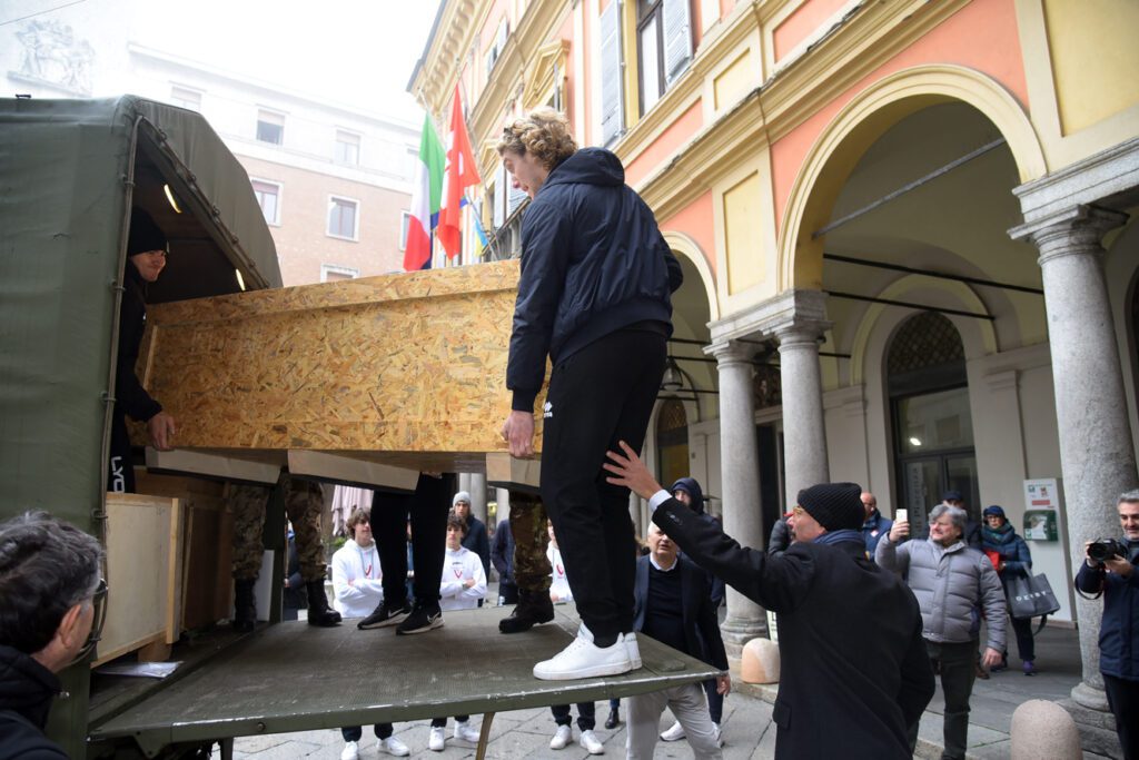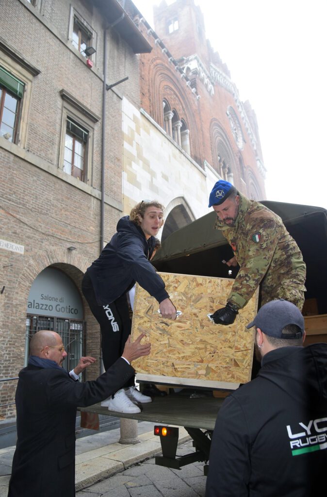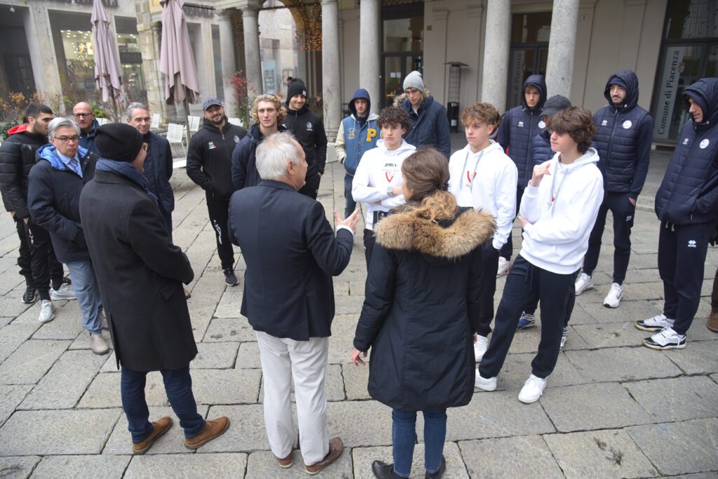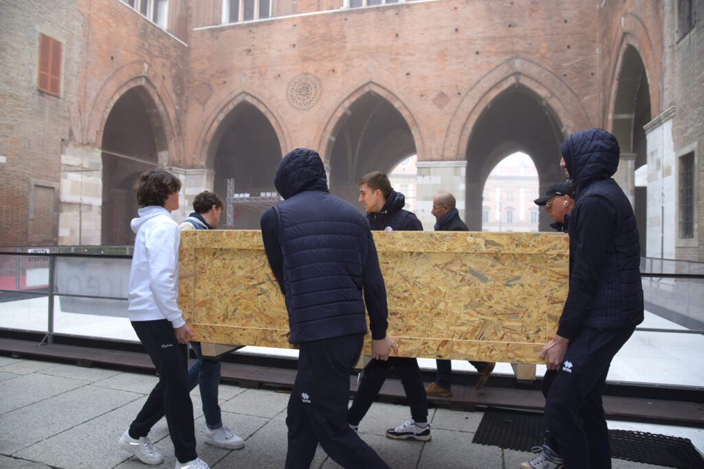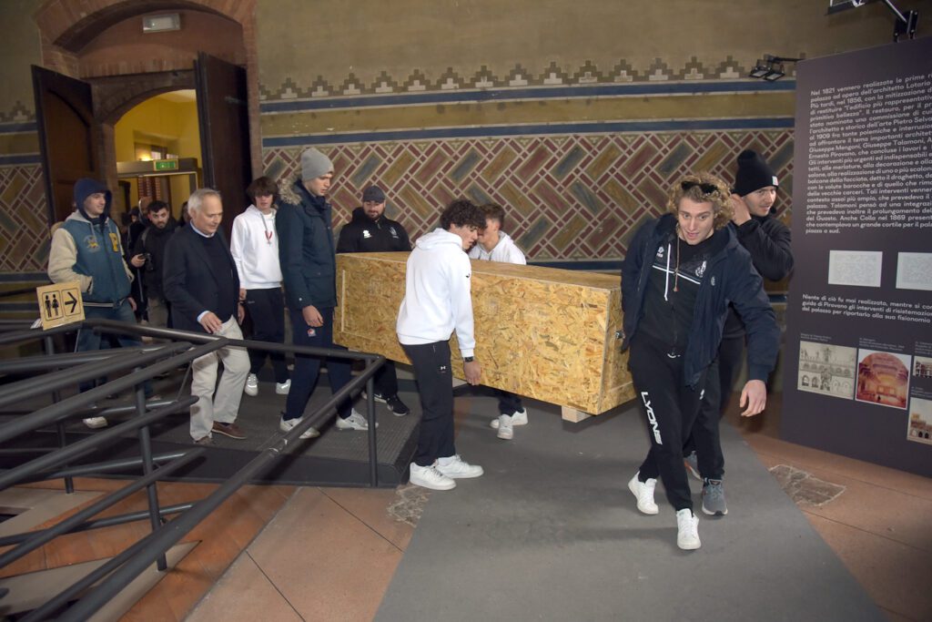 All’arrivo dei sarcofagi da Napoli erano presenti atleti di Assigeco, Gas Sales, Rugby Lyons, Piacenza Calcio e Vittorino da Feltre che hanno dato il proprio contributo nel trasporto fino al salone di Palazzo Gotico.