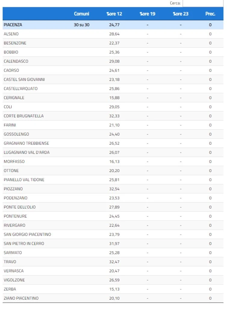 I Comuni dove fino ad ora si è votato di più sono Corte Brugnatella, Piozzano, Travo e San Pietro in Cerro, rispettivamente il 32,33%, il 32,54%, 32,47% e 31,97%.