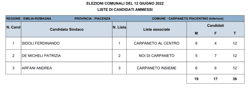 A Carpaneto corrono Ferdinando Sidoli (Carpaneto al Centro), Patrizia De Micheli (Noi di Carpaneto), Andrea Arfani (Carpaneto Insieme).