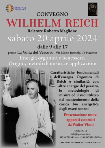 Sabato 20 aprile a Piacenza alla Volta del Vescovo in via Moizo Romolo 78, convegno dal titolo Wilhelm Reich energia Orgonica e benessere. Orario dalle 9 alle 17 viene richiesto un contributo associativo di 30 euro. Informazioni sul sito di Spazio Tesla , iscrizioni attraverso la mail info@soaziotesla.it oppure chiamando Laura al 347 4875534 oppure Walter al 351 8479305.
