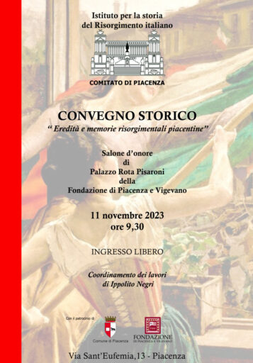 Eredità e memorie risorgimentali piacentine convegno storico sabato 11 novembre a Piacenza. Promosso dall’Istituto per la storia del Risorgimento italiano comitato di Piacenza con il patrocinio del Comune di Piacenza e Fondazione di Piacenza e Vigevano. Ingresso libero.