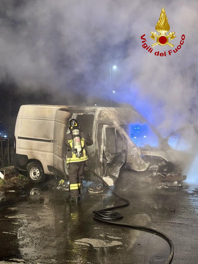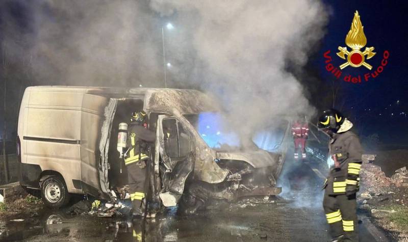 Esce di strada e il furgone prende fuoco, il conducente lascia l’abitacolo appena in tempo – FOTO