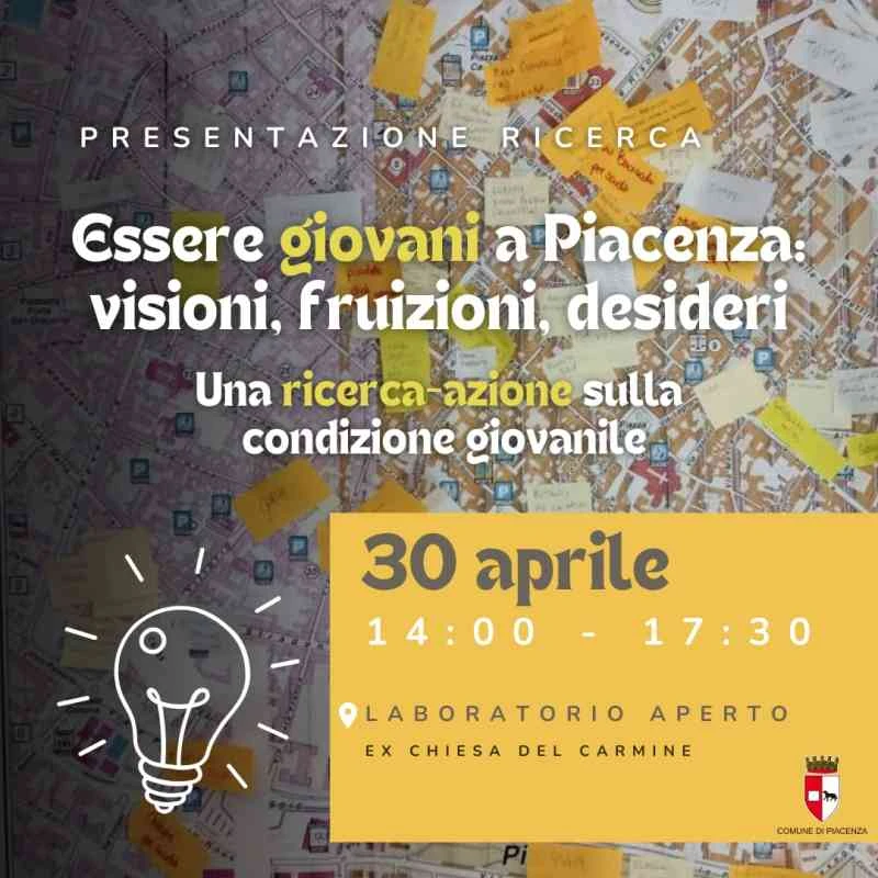 Martedì 30 aprile, dalle 14 alle 17.30 circa, il Laboratorio Aperto del Carmine in piazza Casali ospiterà l’incontro pubblico di presentazione dell’indagine effettuata dall’Istituto Iress, su affidamento dell’Amministrazione comunale, “Essere giovani a Piacenza: visioni, fruizioni, desideri. Una ricerca-azione sulla condizione giovanile”.