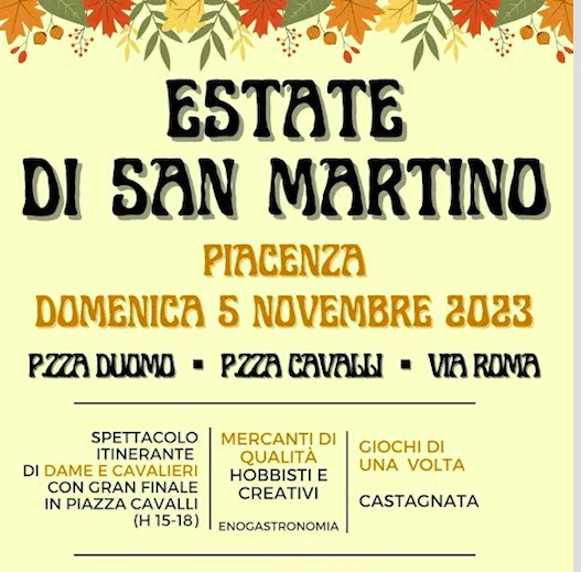 Sfilata medievale, giochi, shopping e beneficenza,: il centro storico di Piacenza si accende domenica 5 novembre con l’Estate di San Martino. L’iniziativa si svilupperà tra Piazza Cavalli e Piazza Duomo, dalle 8.30 alle 18.30 si potranno acquistare prodotti agroalimentari e di artigianato di qualità e intrattenersi con performance di artisti di strada, mentre i più piccoli potranno invece divertirsi coi “giochi di una volta”.