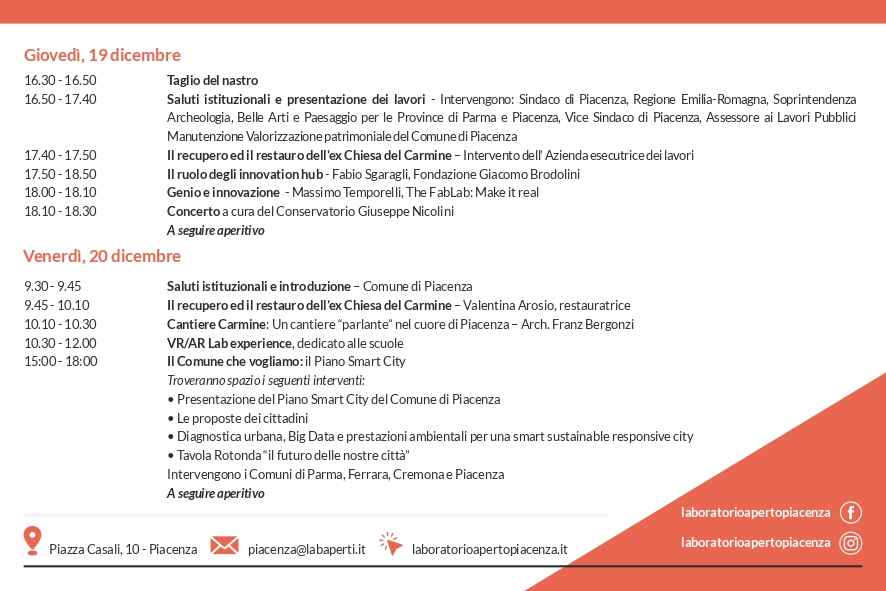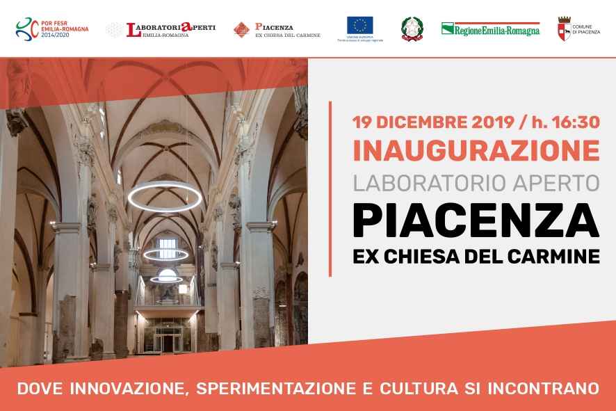 Ex chiesa del Carmine, tutto pronto per l’inaugurazione del Laboratorio Aperto di Piacenza. L’evento si svolgerà giovedì 19 dicembre, alle ore 16.30. Venerdì 20 dicembre, gli eventi proseguiranno con incontri destinati alle scuole e il convegno “Il Comune che vogliamo: il Piano Smart City”.