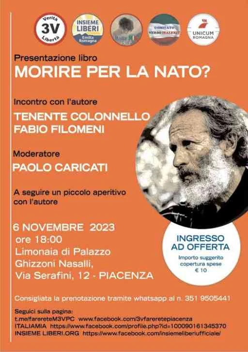 Lunedì 6 novembre, a Piacenza, alle ore 18.00, se ne parlerà insieme al tenente colonnello Fabio Filomeni, 35 anni di attività militare, già incursore paracadutista nel 9° Reggimento d’Assalto “Col Moschin”, reparto operativo delle Forze Speciali dell’Esercito Italiano. Filomeni presenterà presso la Limonaia di Palazzo Ghizzoni Nasalli il suo ultimo libro MORIRE PER LA NATO?
