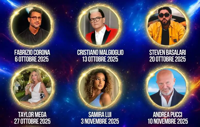 Si comincia il 6 ottobre con Fabrizio Corona, personaggio che non ha certo bisogno di presentazioni e che è riuscito nell’ultimo periodo a creare un ponte tra televisione e social, sempre con successo. Il 13 ottobre è la volta di Cristiano Malgioglio, il 20 ottobre spazio alla star del web Steven Basalari. Si prosegue con il fascino e la simpatia di Taylor Mega, il 27 ottobre, e con il talento della showgirl Samira Lui, in programma il 3 novembre. Il 10 novembre preparatevi a ridere a crepapelle con il mitico Andrea Pucci. Chiusura il 24 novembre ancora con Fabrizio Corona.