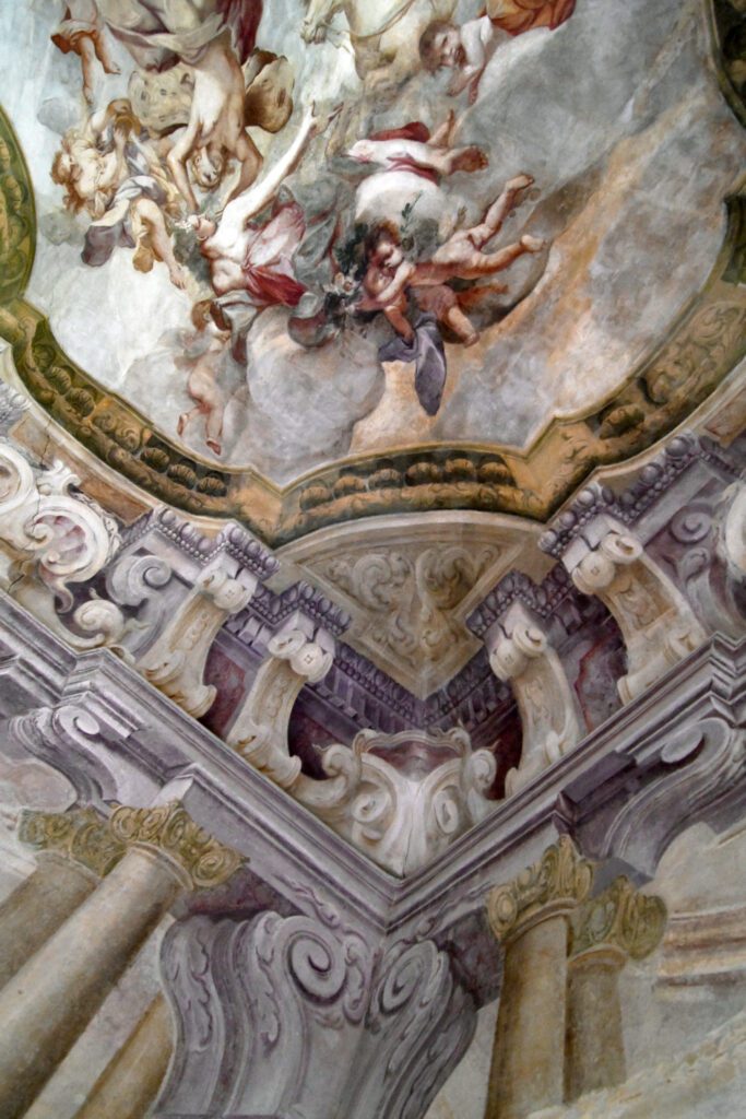 Dalla Pinacoteca si avrà accesso a due mezzanini, aperti in via eccezionale al pubblico. In quello superiore, situato tra il piano nobile e l’ultimo piano, originariamente destinato ad alcova delle damigelle, si potranno ammirare le “Storie Zefiro e Flora” dipinte tra 1710 e 1711 dal fiorentino Sebastiano Galeotti. Le dimensioni contenute della stanza permettono di apprezzare da vicino la grande qualità dell’opera, ma allo stesso tempo la geniale quadratura ideata dal cremonese Francesco Natali, collaboratore in più occasioni del Galeotti, il quale dilata illusoriamente lo spazio tanto da far percepire assai più lontane da noi le mitologiche figure volteggianti. La saletta è senza dubbio una delle più pregevolmente decorate del Palazzo, nonostante la sua difficile accessibilità.