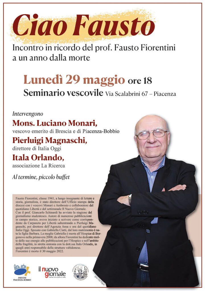 “Ciao Fausto”: è il tema dell’incontro in ricordo del prof. Fausto Fiorentini a un anno dalla morte avvenuta il 30 maggio 2022. L’iniziativa, promossa dalla diocesi di Piacenza-Bobbio e dal settimanale Il Nuovo Giornale, si svolge lunedì 29 maggio alle ore 18 al Seminario vescovile di via Scalabrini 67 a Piacenza. Intervengono mons. Luciano Monari, vescovo emerito di Brescia e di Piacenza-Bobbio, il giornalista Pierluigi Magnaschi, direttore di Italia Oggi, e Itala Orlando, dell’associazione La Ricerca. Al termine, piccolo buffet.