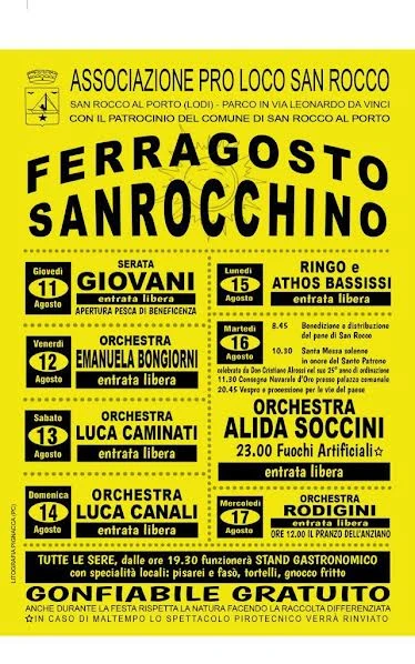 Ferragosto Sanrocchino, dall’11 al 17 agosto una settimana di festa a San Rocco al Porto. Si potranno gustare tante prelibatezze piacentine come pisarei e faso’ , tortelli e gnocco fritto.