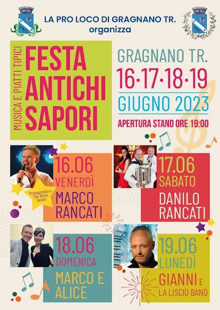 Festa Antichi Sapori 2023 a Gragnano Trebbiense dal 16 al 19 giugno. Gli stand, aperti dalle ore 19, propongono piatti tipici e ogni serata sarà allietata dalla musica.