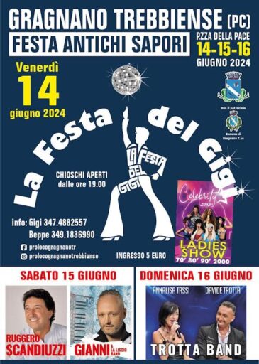 Da venerdì a domenica ogni sera: musica e piatti tipici anche per celiaci. Il programma prevede il 14 giugno “La Festa Del Gigi”, mentre il sabato spazio al ballo con Ruggero Scandiuzzi con Gianni e la Liscio band. Infine domenica si balla con “Trotta Band”