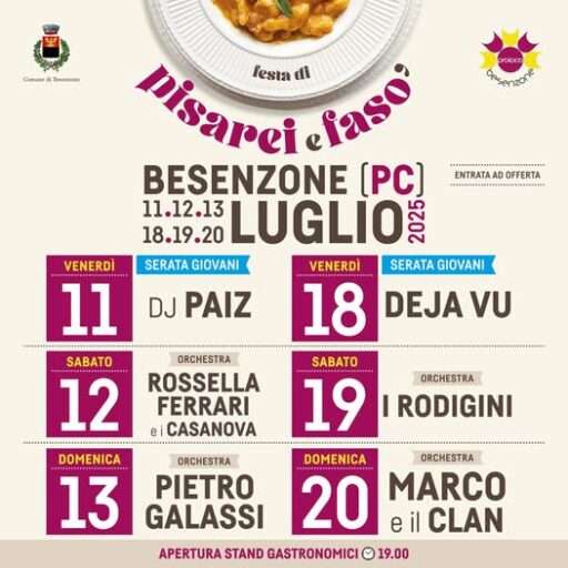 Festa dei Pisarei e Fasò 2025 a Besenzone dall’11 al 20 luglio. Due fine settimane tra specialità tipiche e danze. Ingresso a offerta.