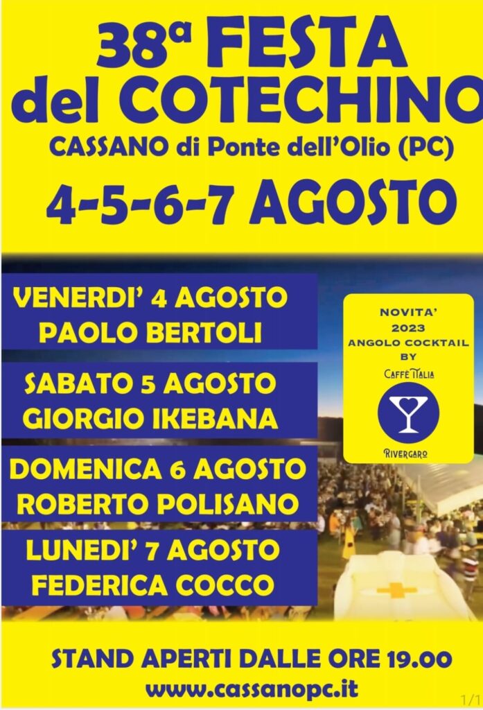 Festa del Cotechino 2023 a Cassano di Ponte dell’Olio dal 4 al 7 agosto. Un’evento ormai diventato una tradizione giunto quest’anno alla 38^ edizione.