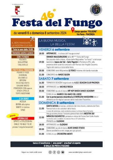 Festa del Fungo, a Piacenza la 46esima edizione dal 6 all’8 settembre al Campo Sportivo di via Pavia. Tre giorni con specialità a base di funghi, aperi-music, esibizioni e…tanto divertimento.
