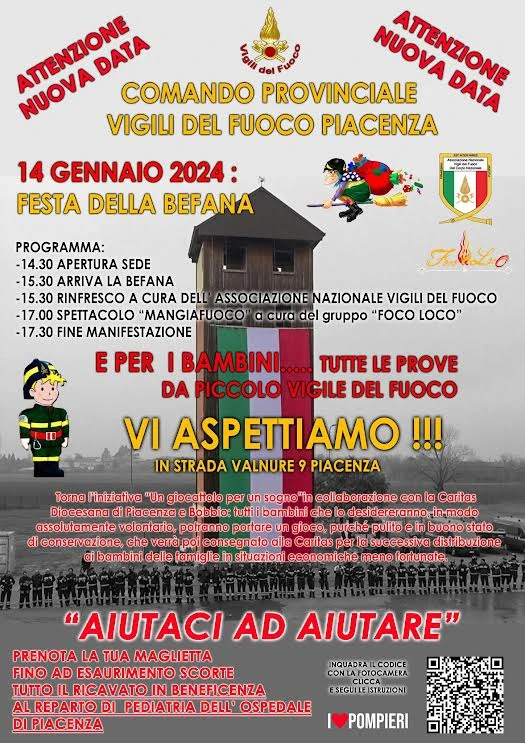 La Festa della Befana 2024 con i Vigili del Fuoco di Piacenza è stata rinviata a domenica 14 gennaio. L’inizio è previsto alle ore 14.