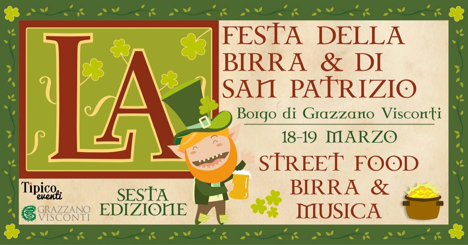 Street food e musica accompagnano la Festa della Birra e di San Patrizio il 18 e 19 marzo a Grazzano Visconti. Tipico Eventi torna nell’iconico borgo con la Sesta Edizione dell’evento più verde dell’anno. Si tratta di un weekend all’insegna della migliore birra e dell’ottima compagnia, in una cornice suggestiva e folkloristica.