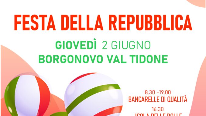 Giovedì 2 Giugno, in occasione della Festa della Repubblica a Borgonovo Val Tidone, è in programma una giornata di festa e di shopping con i Mercanti di Qualità. Ci saranno le bancarelle di qualità con le ultime tendenze per la stagione estiva nell’abbigliamento firmato, negli accessori moda, nelle calzature. Inoltre sui banchi dei Mercanti di Qualità si potrà trovare il made in Italy nell’intimo e biancheria per la casa. Non mancheranno fiori e piante, i prodotti enogastronomici, l’ oggettistica e l’artigianato di qualità.