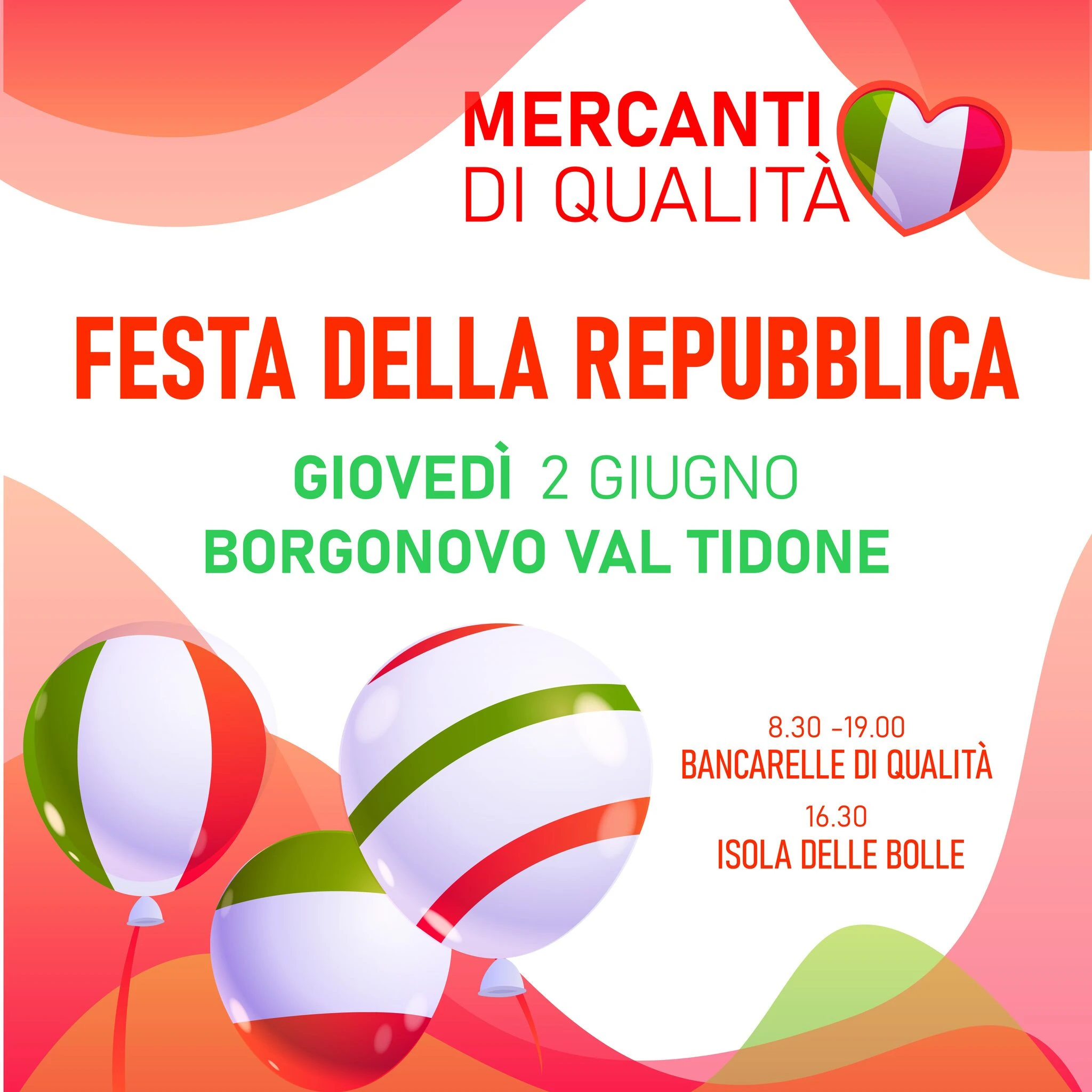 Giovedì 2 Giugno, in occasione della Festa della Repubblica a Borgonovo Val Tidone, è in programma una giornata di festa e di shopping con i Mercanti di Qualità. Ci saranno le bancarelle di qualità con le ultime tendenze per la stagione estiva nell’abbigliamento firmato, negli accessori moda, nelle calzature. Inoltre sui banchi dei Mercanti di Qualità si potrà trovare il made in Italy nell’intimo e biancheria per la casa. Non mancheranno fiori e piante, i prodotti enogastronomici, l’ oggettistica e l’artigianato di qualità.